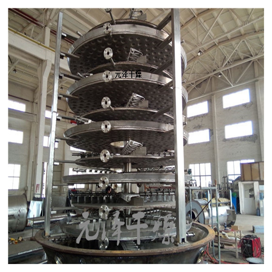 湿物料自加料器连续地加到干燥器上部层干燥盘上,带有耙叶的耙臂作回转运动使耙臂作回转运动使耙叶连续地翻抄物料。物料沿指数螺旋线流过干燥盘表面,在小干燥盘上的物料被移送到外缘,并在外缘落到下方的大干燥盘外缘,在大干盘上物料向里移动并从中间落料口落如下一层小干燥盘中。大小干燥盘上下交替排列,物料得以连续地流过整个干燥器。中空的干燥盘内通入加热介质,加热介质形式有饱和蒸汽、热水和导热油,加热介质由干燥盘的一端进入,从另一端导出。已干物料从后一层干燥盘落到壳体的底层,后被耙叶移送到出料口排出。湿份从物料中逸出,由设在顶盖上的排湿口排出,真空型盘式干燥器的湿气由设在顶盖上的真空泵口排出。从底层排出的干物料可直接包装。通过配加翅片加热器、溶剂回收冷凝器、袋式除尘器、干料返混机构、引风机等辅机,可提高其干燥的生产能力,干燥膏糊状和热敏性物 料,可方便地回收溶剂,并能进行热解和反应操作。