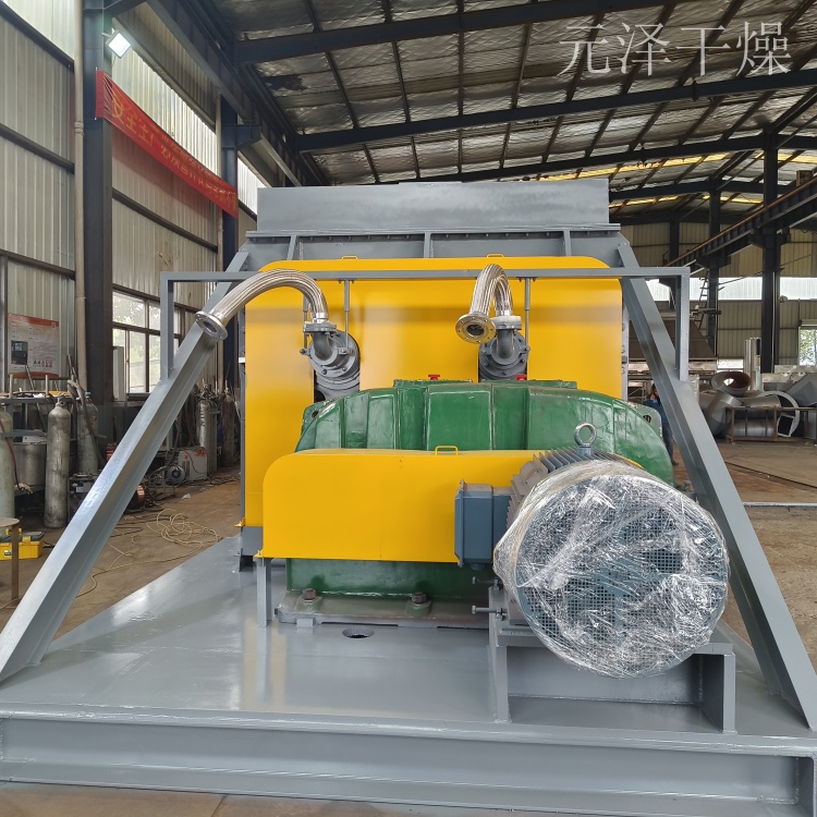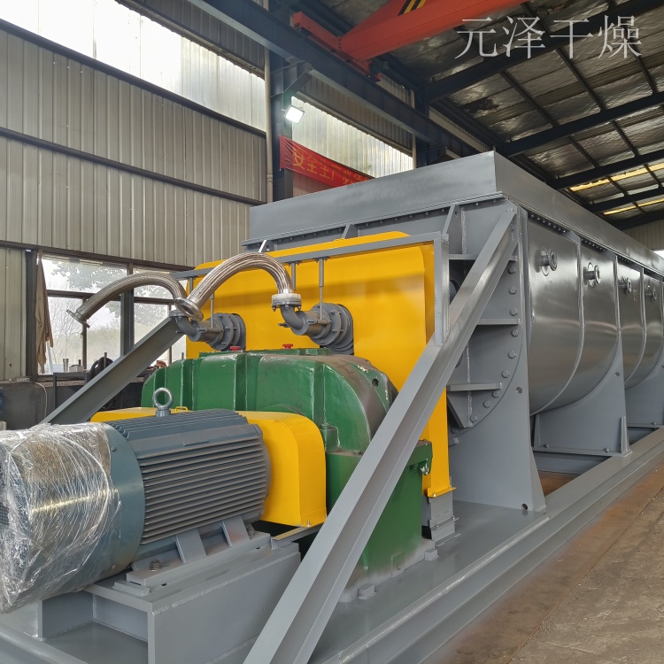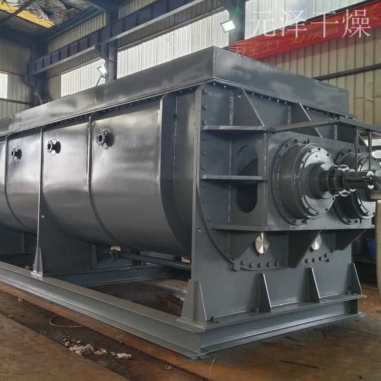 空心轴上密集排列着楔型中空浆叶,热介质经空心轴流经浆叶。单位有效容积内传热面积很大,热介质温度从-40℃到320℃,可以是水蒸汽,也可以是液体型:如热水、导热油等。间接传导加热,没有携带空气带走热量,热量均用来加热物料。热量损失仅为通过器体保温层向环境的散热。楔型浆叶传热面具有自清洁功能。物料颗粒与楔型面的相对运动产生洗刷作用,能够洗刷掉楔型面上附着物料,使运转中一直保持着清洁的传热面。浆叶干燥机的壳体为Ω型,壳体内一般安排二到四根空心搅拌轴。壳体有密封端盖与上盖,防止物料粉尘外泄而充分发挥作用。