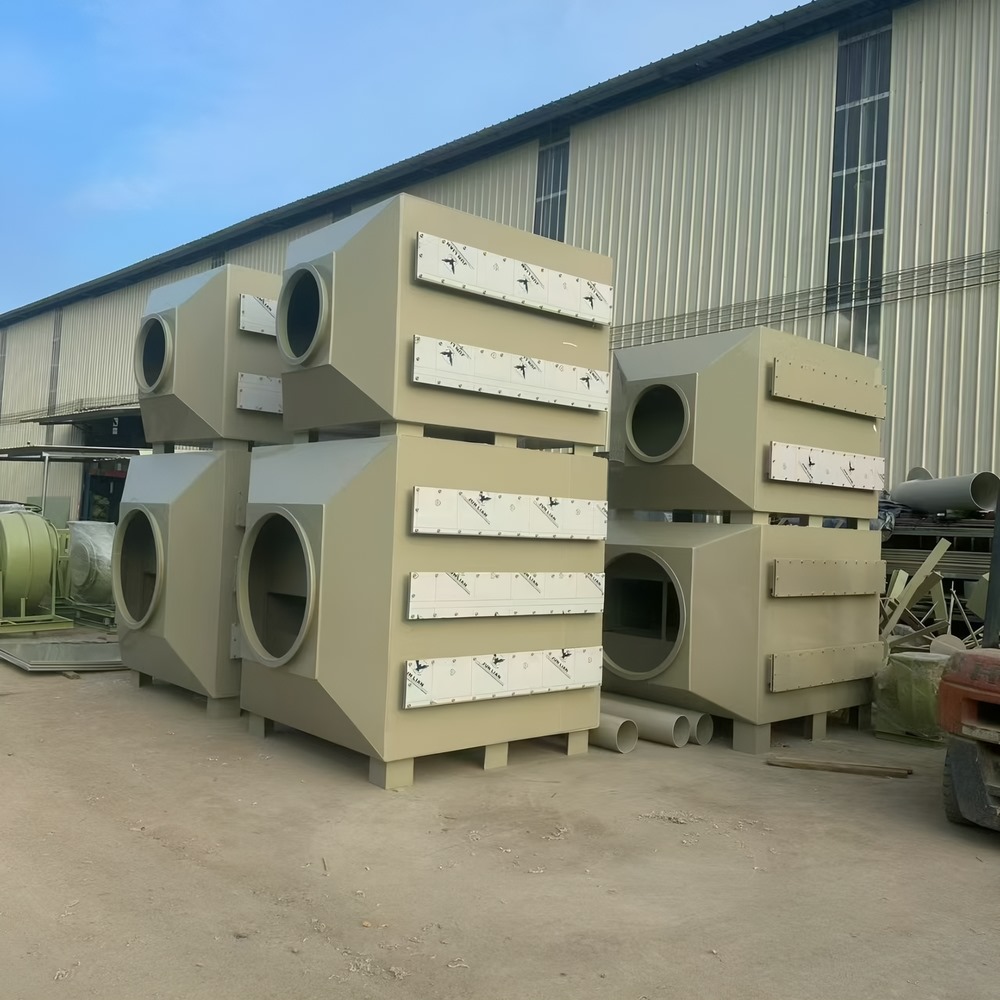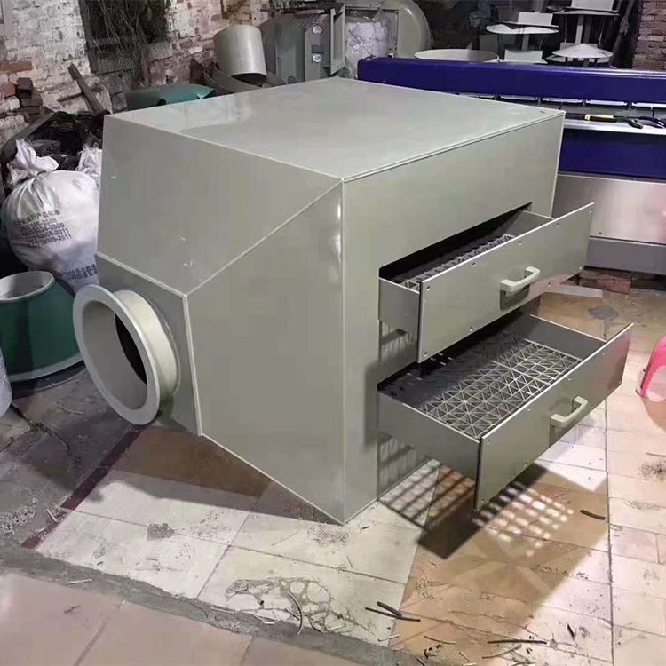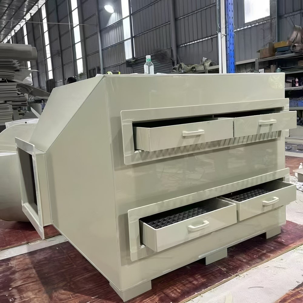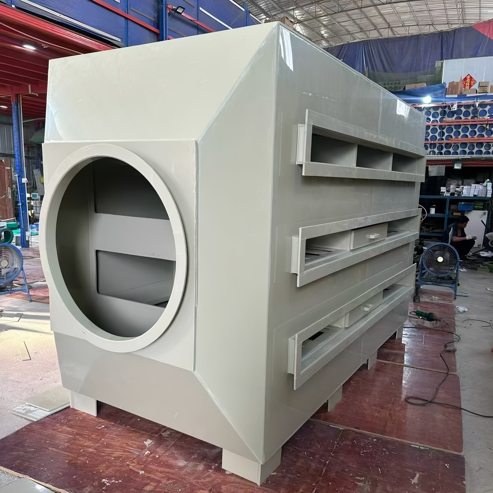 PP吸附箱是用聚丙烯板材焊接成型、内置活性炭床层的干式废气处理设备;废气经气流分布后均匀流过炭层,通过物理吸附(范德华力)+部分化学吸附,截留VOCs、酸碱异味、H₂S等有害分子,净化后达标排放;耐pH 1–14、工作温度一般**-20℃至80℃**(超温易变形)。