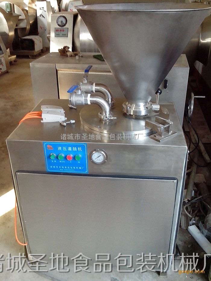 2.采用活塞式液压驱动,调准工作压力后在液压缸的作用下,使筒内的物料产生压力后将料挤出,适用物料范围较广,尤其对较干的料馅相对其他灌肠机效率更佳。
