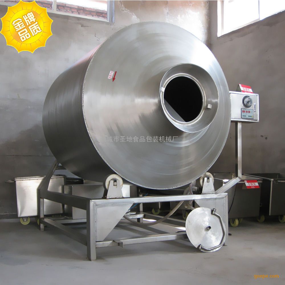 滚揉机是在真空状态下,利用物理冲击的原理,使肉块和肉馅在滚筒内上下翻动,自我甩打相互撞击,摔打,使腌渍液在原料肉中被均匀的吸收。同时还增强了肉的结合力,提高了肉的弹性,增加了保水性,提高了出品率。保证肉制品的切片性,防止切片时产生破碎裂口,提高产品的断面效果和产品的柔嫩性、保持肉制品组织结构稳定。