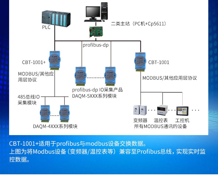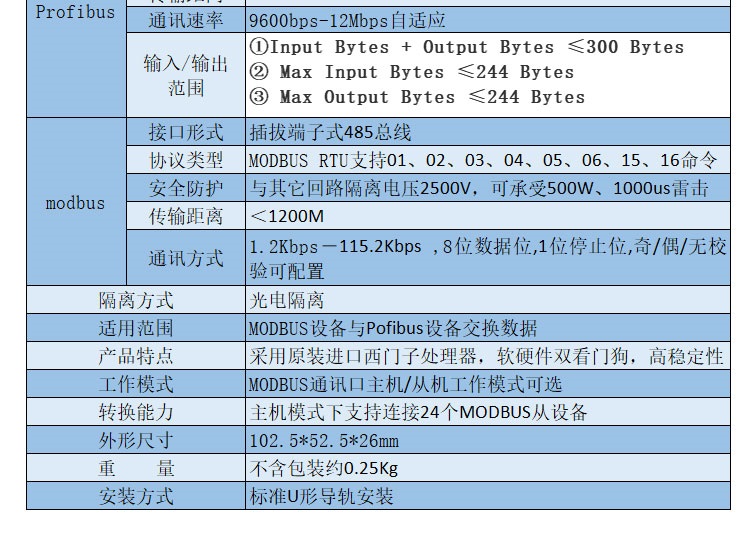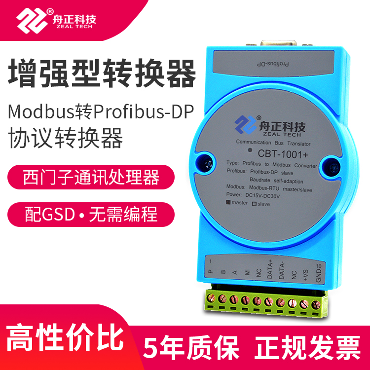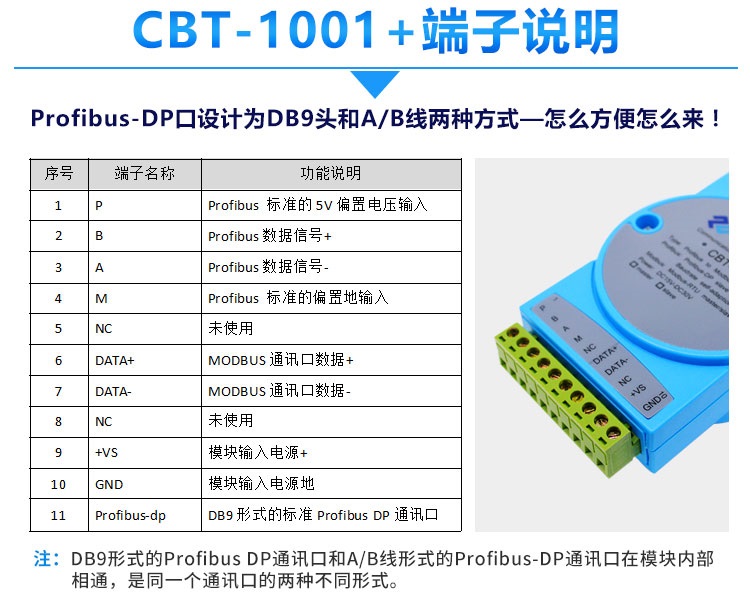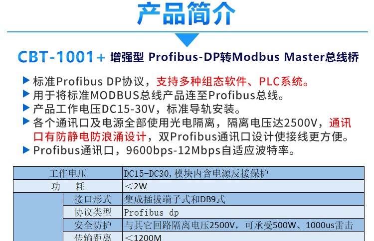 CBT-1001M+ v1.1采用标准Profibus DP协议,支持多种组态软件、PLC系统。用于将标准MODBUS总线产品连至Profibus总线,产品工作电压DC15-30V,标准导轨安装,各个通讯口及电源全部使用光电隔离,隔离电压达2500V,同时通讯口有防静电防浪涌设计,双Profibus通讯口设计使接线更方便,Profibus通讯口9600bps-12Mbps自适应波特率。