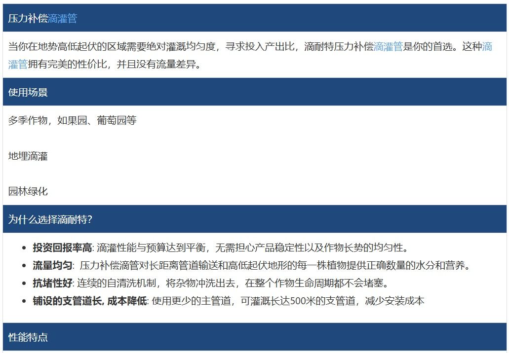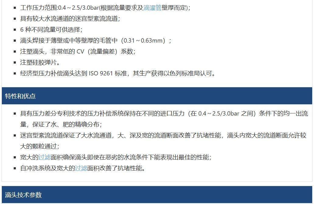 •紊流迷宫型确保宽流道。大,深和宽的横切面改进了抗阻塞能力;滴头内宽大的流道断面允许较大的颗粒通过。