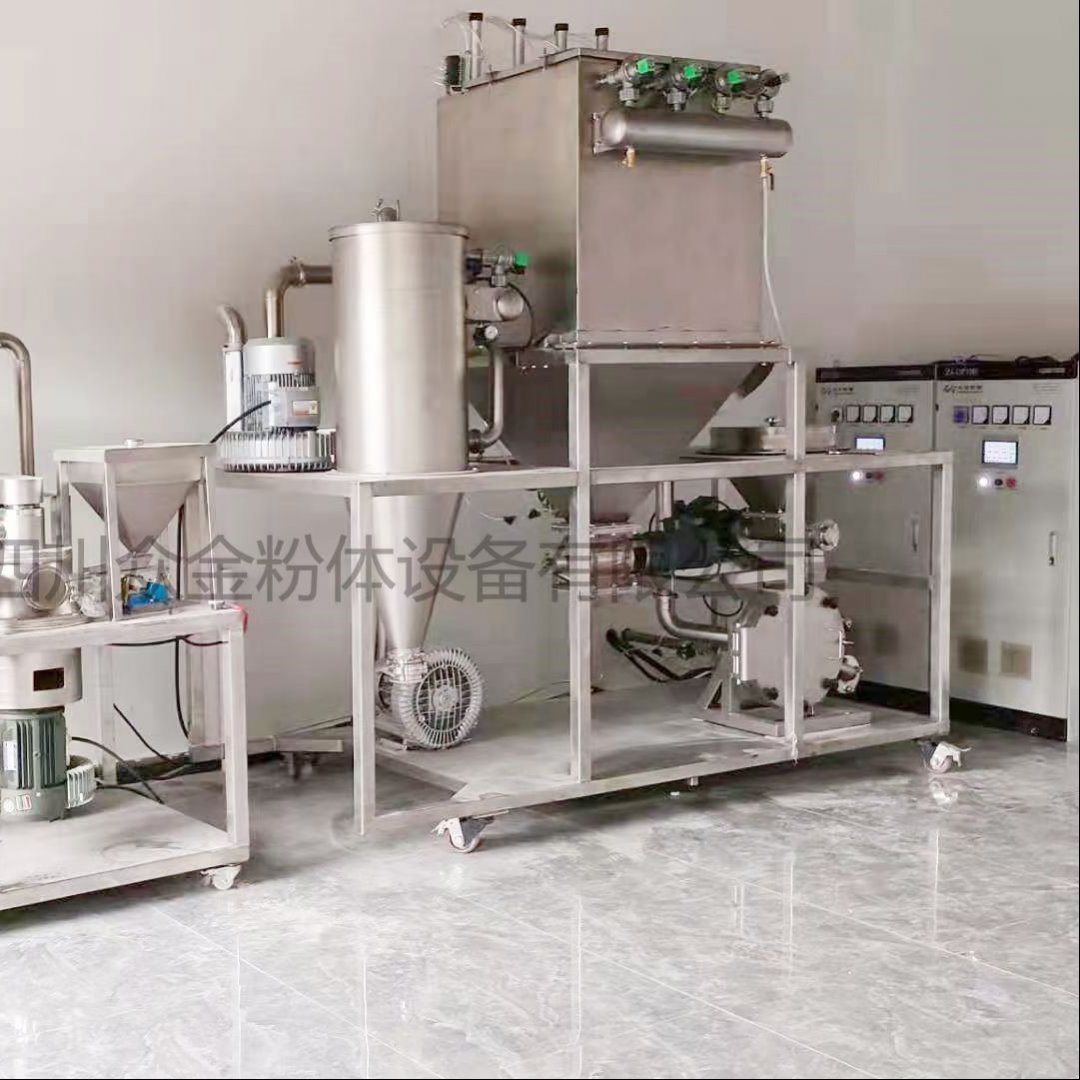 原料仓内的原料通过变频控制的喂料装置将物料输送到气流磨磨腔内进行粉碎(喂料装置的启停由气流磨的系统负压来控制)。在气流粉磨粉碎区有4个喷嘴,压缩空气经喷嘴加速成超音速气流后射入粉碎区使物料呈流态化,并给物料颗粒进行加速。然后,被加速的颗粒在各喷嘴的交汇点相互对撞粉碎,粉碎后的物料被上升气流输送至分级区,由水平布置的分级轮筛选出达到粒度要求的细粉(无大颗粒产生),并进入后端收集装置(收尘器)进行收集并排出;未满足粒度要求的粗粉返回粉碎区继续粉碎。