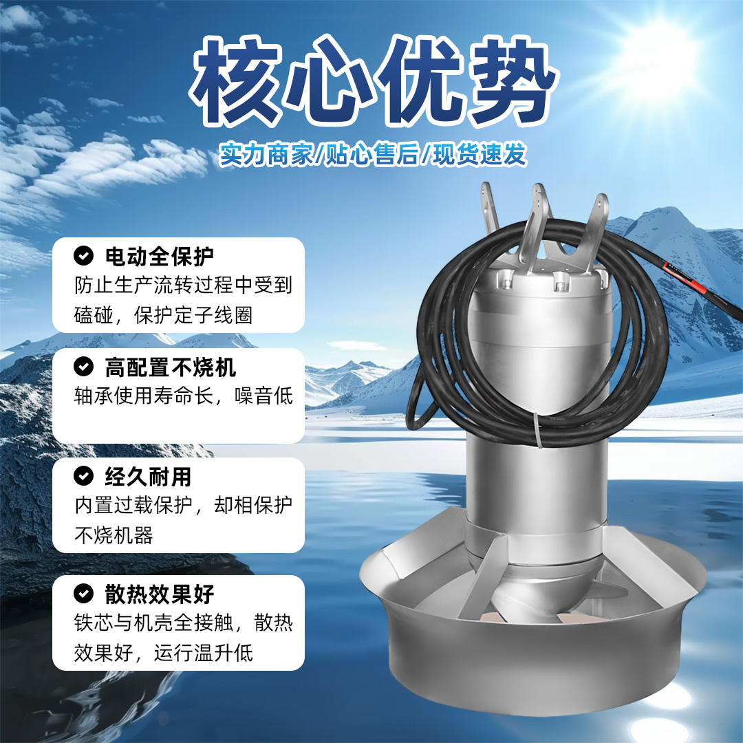 QJB型潜水搅拌机混合型适用于污水处理厂的工艺流程中推进搅拌含有悬浮物的污水、稀泥浆、工业过程液体等,创建水流,加强搅拌功能,防止污泥沉淀及产生死角,是市政和工业污水处理工艺流程上的重要设备,在水处理工艺流程中,可实现生化过程中固液二相和固液气三相的均质,流动的工艺要求。QJB型潜水搅拌机由潜水电机、叶桨和安装系统等组成。根据传动方式的不同,潜水搅拌机可分为:混合搅拌和低速推流两大系列。 混合搅拌系列产品常选用多级电机,采用直联式结构,它与传统相比,具有结构紧凑、能耗低、效率高、便于维便于维护保养等优点。叶轮制造精度高、推力大。QJB型潜水搅拌机系列产品适用于需要固液搅拌、混合的场合。 二、不锈钢潜水搅拌机的工作原理: